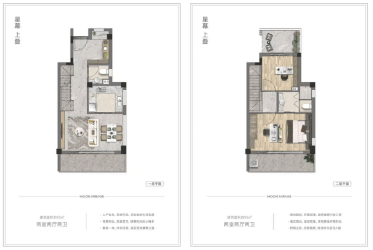 来看户型,面积段有两种——建面约95㎡下叠、上叠;建面约150㎡下叠、上叠。