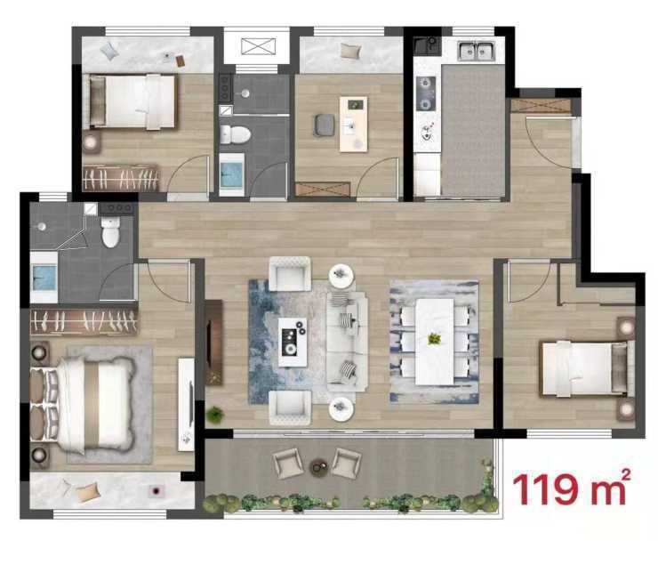洋房:108-119㎡四房,均价约1.6万/㎡,得房率84%