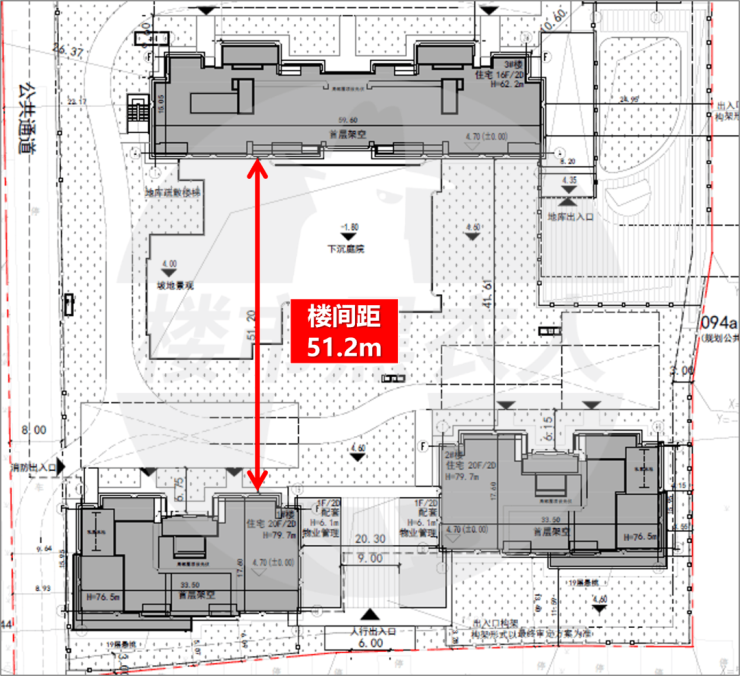 从规划图来看,社区内部广泛运用水景:共有2处大型集中水景+1处宅间水景,周边还有下沉庭院+坡地景观,大概率此处未来社区会所的位置。值得一提的是,项目的楼间距全部在35米以上,最大楼间距达到了约51.2米。