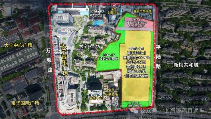 该地块西侧是宝华万豪酒店,再往西就是大宁音乐广场,地块东侧就是新梅共和城,南侧刚好就是大宁公园,整体城市界面可圈可点。