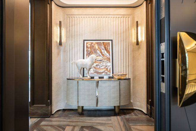 例如入户玄关铺设有“石材皇后”鱼肚印象,这种级别的奢石在很多顶豪项目中通常仅作局部镶嵌