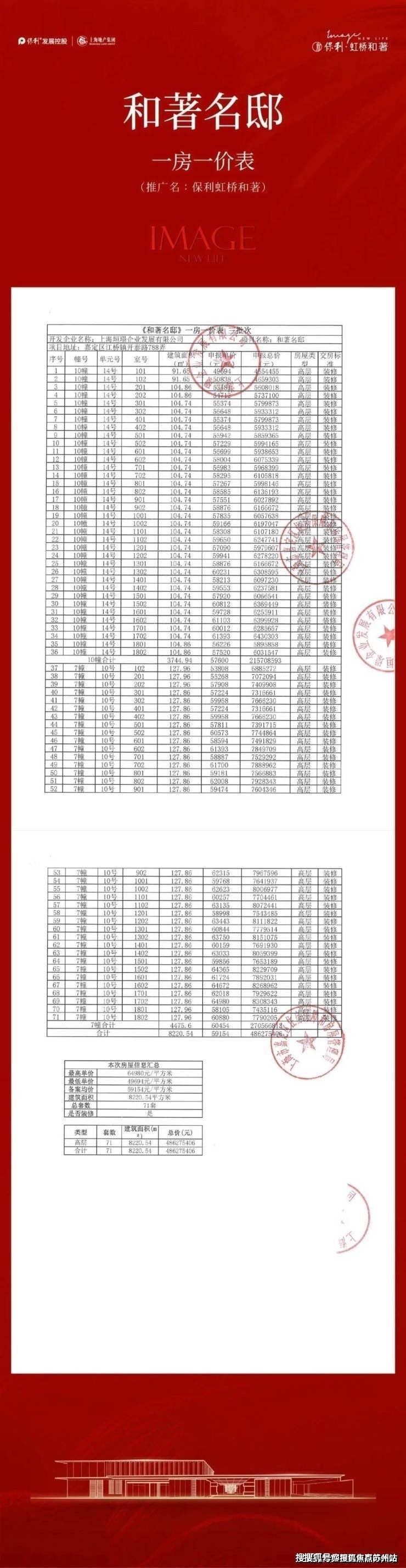 48、均价:即物业的平均销售价格,将本物业各套房子的销售价格相加之后的和除以各单位建筑面积的和数,即可得出每平方米的均价)。
