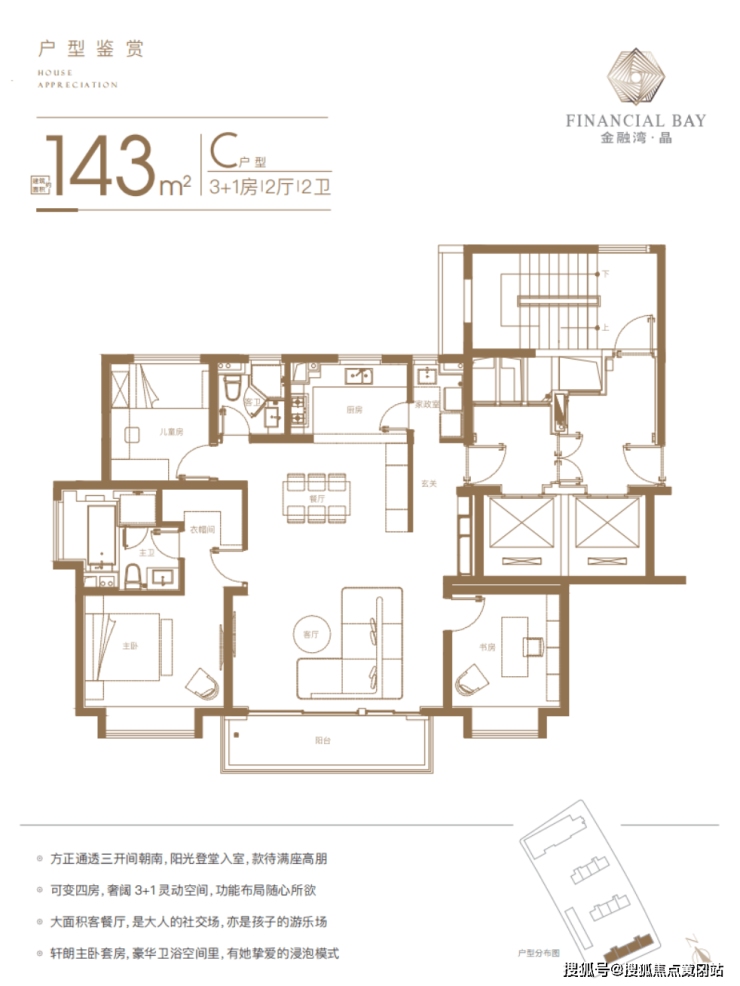 而建面约143平户型60套,均价约33639元/平,3+1灵动空间,可变4房,户型通透,大面积客餐厅,彰显主人豪迈气质。
