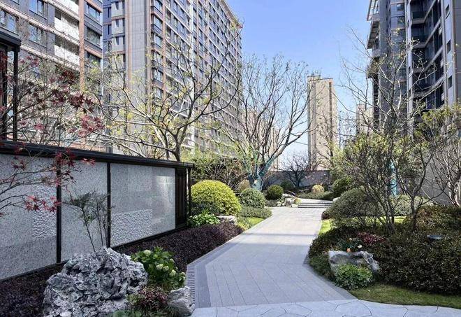 一条清韵石径,挑选造型独特的石头、三两组合成景,搭配特选的造型植物,极具艺术美感。而清泉石流景墙背后,就是未来业主的生活区。
