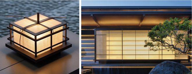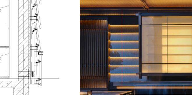 正立面的橱窗取法于中式地灯的形象,抽象出其中框架构图、薄纱质感、氤氲灯光的关键特点,多层表皮,立面的纵深感,现代悬挑与中式风格的结合。