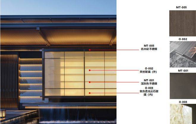 通过多层表皮的处理方式,外层夹丝玻璃,内层云石玻璃,悬挑出的空腔中再设置隐藏的灯带,摆脱单纯的符号化平面化的处理方式,充分发挥现代幕墙工艺优势,极大的丰富了立面的层次。此外宫灯悬挑的形式与下方的景观叠水结合,打造出面向城市的视觉焦点。