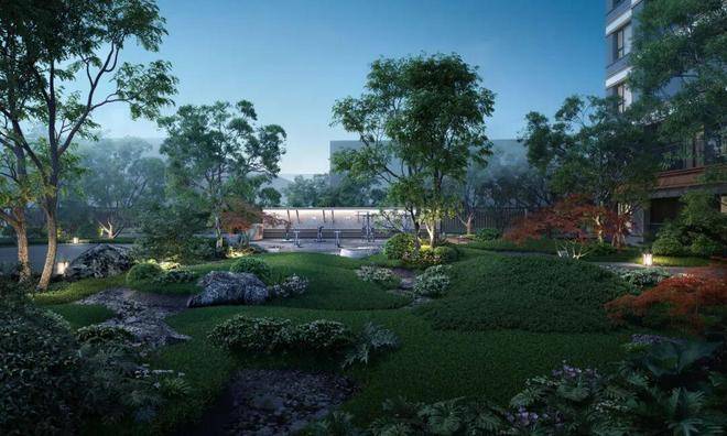 四进“禅林雅静”绿植搭配林荫绿岛,花木扶疏,依托自然景观,以林荫、景石、中式亭台等元素打造出禅意迎宾园景,收放有致,礼迎户主归家。
