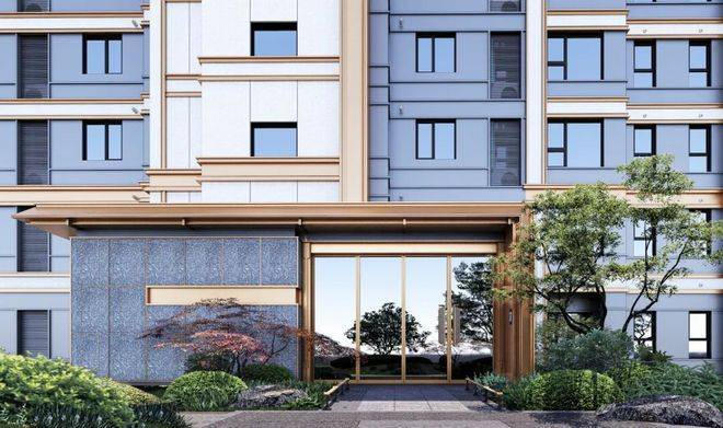 底部基座局部采用石材等高品质材料搭配香槟金色铝板,给予业主更尊贵的归家仪式感。