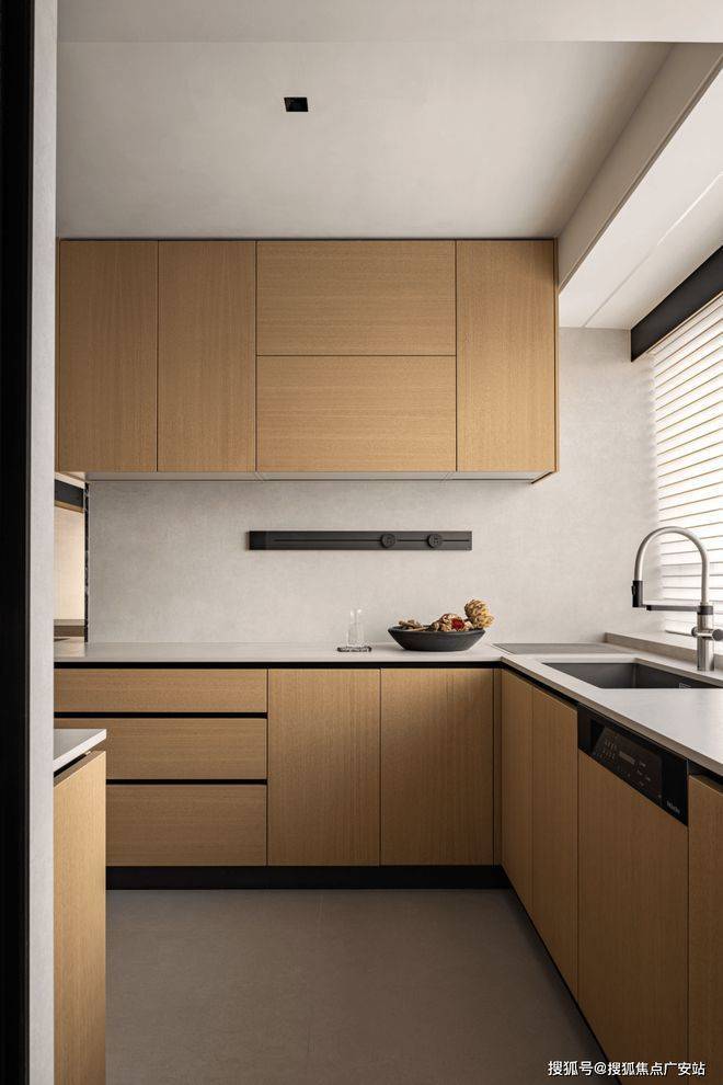 【厨房】水槽顶灯、不锈钢防污板、带开关插座+防溅盒、抽卡式水龙头、吊柜下扫灯、台面细节