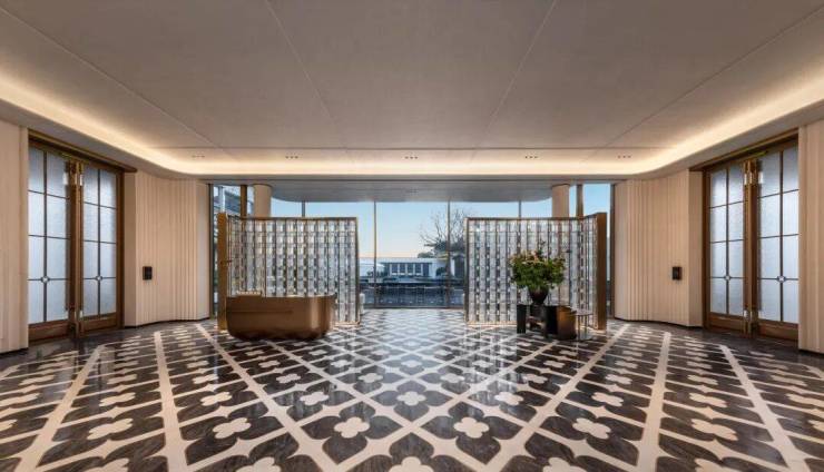 入口两侧油橄榄树姿态优雅,自带松弛感;归家序厅两侧有种植桂花树,隐喻"蟾宫折桂"的祝福;地面铺装芝麻黑花岗岩与福鼎黑花岗岩,不仅沉稳大气还有活泼灵动……