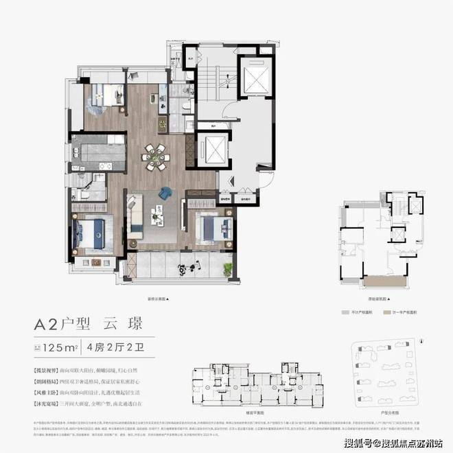 户型特点:建筑面积约 125㎡稀缺四房,三面采光、270° 环幕飘窗;