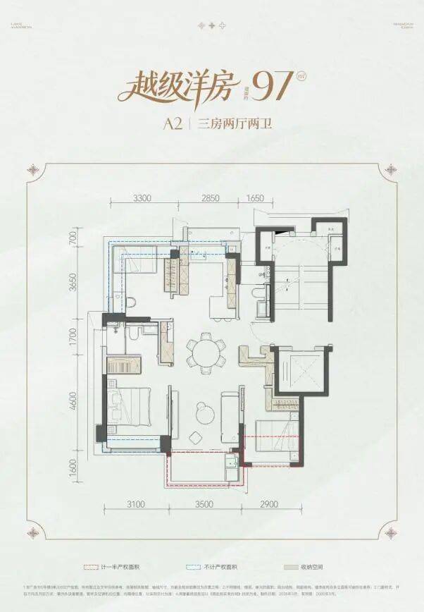 约97㎡「越级洋房」三室两厅两卫,以约86-90%的高实得率,采用零走道飞机户型设计,相当于常规市面产品的109m2产品,实现全明正三房的舒适体验。