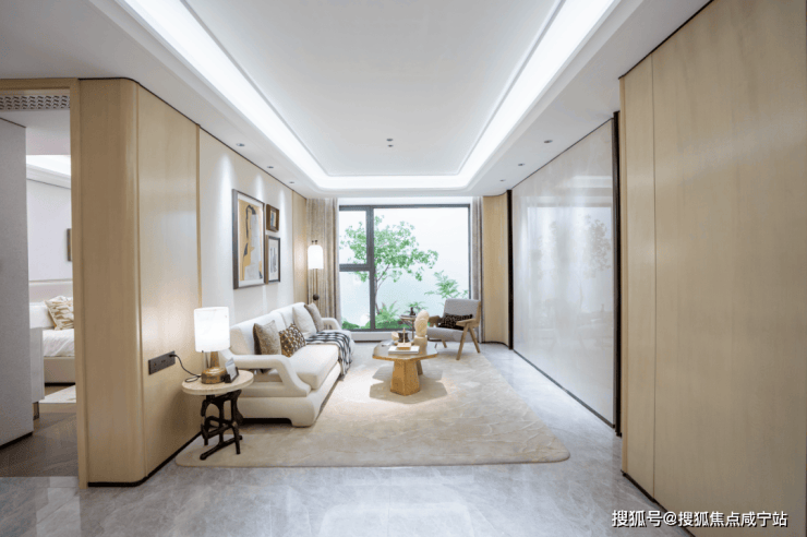 室内墙面大面积铺设温润质感的木饰面,墙面转角处采用曲面处理,为空间注入温馨舒适的居住氛围.