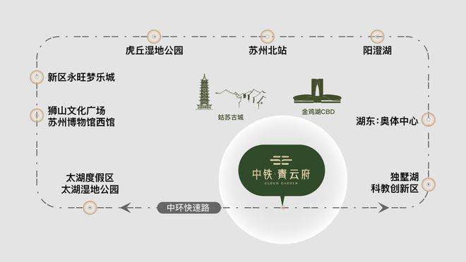 ◎发展之环:中环东接园区产经引擎,西融狮山创新脉络,南承太湖新城生态蓝图,北启高铁枢纽经济,便捷通达苏州多中心,启幕现代化城市发展新篇章。