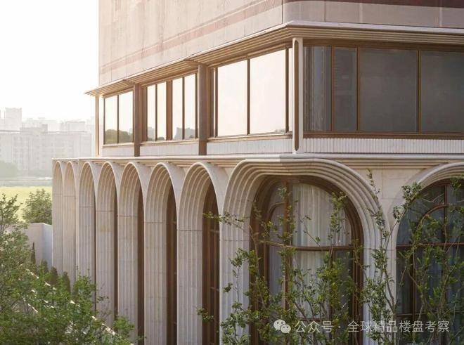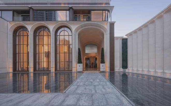 项目采用12米高拱券大门、宝格丽绿石材与古铜金属线条交织,形成迎宾序列;意大利贝金米黄石材弧形景墙与铜马雕塑传递“龙马精神”寓意。近十二米通高的拱券,通体以石材打造,层层叠涩,气势恢宏。