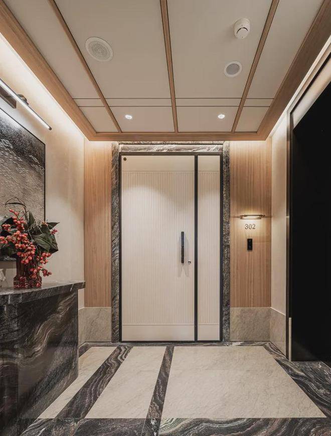 客厅的吊顶一整圈选用稀有的紫山水石材,施工难度极大,每一块的纹理都是独一无二的艺术品。玄关处精心设计的收纳系统可轻松容纳百双鞋子,解决了高端客群的实际痛点。