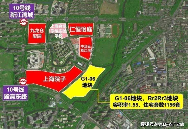 G1-06地块占据新江湾城南部门户位置,东邻高端项目上海院子,北侧紧邻在建的上海市交通大学附属中学杨浦实验学校(含九年一贯制及高中部),步行700米可达10号线殷高东路站。