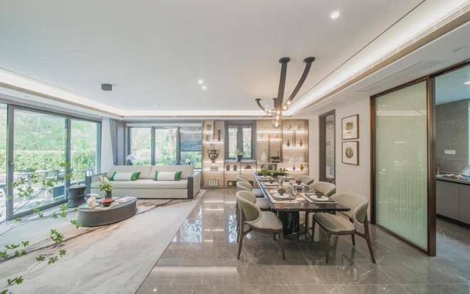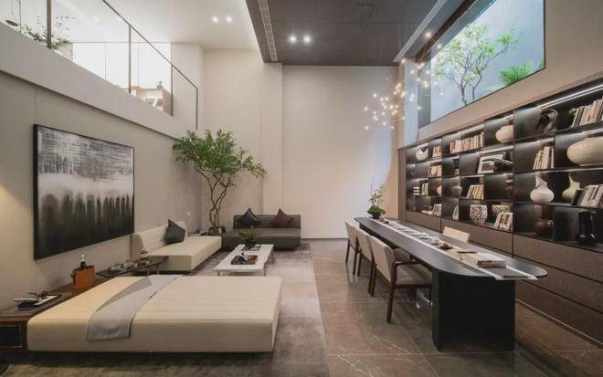 看一眼外立面,白色石材、香槟色的木纹铝板、大面积玻璃的拼接组合,怎么看都不像一个门槛只有400万+的低密叠墅。玉琮水景、山石跌水等等融入景观的大量良渚文明元素,弥漫着专属于杭州的千年气韵。满眼的“越级感”再配上只有1.2的超低容积率,最终才呈现出一座全低密真双叠大盘的样子。
