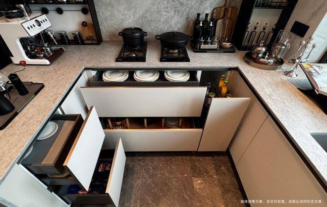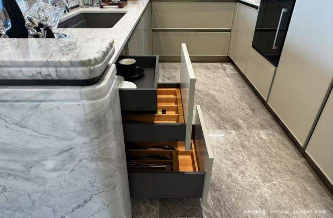 为使厨房成为「真正幸福之地」,璞元在各个细微之处倾注关怀,从地柜拉篮系统,到上柜系统,再到抽屉分格系统,浅抽与深抽搭配——