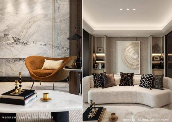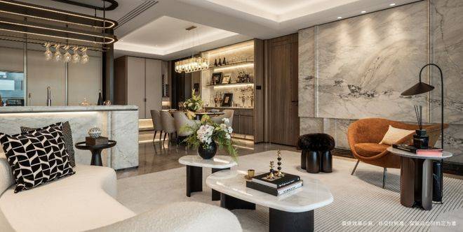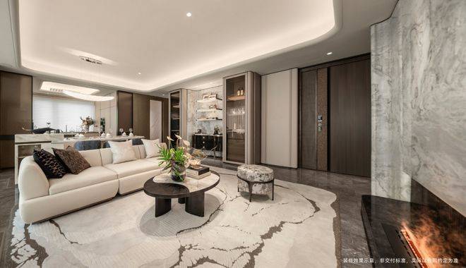 为一块奢石弧形工艺,投入翻倍的成本,整屋坚持用一种昂贵的木饰面贯通始终,从而实现整体艺术风格的统一。
