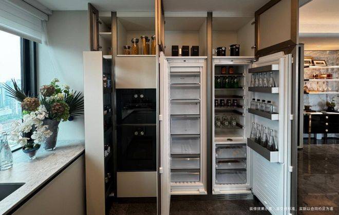 厨房地柜拉篮、上柜全维收纳系统,与双开门大尺度冰箱、多功能烤箱等厨电奢品,以高端性能和合理格局,承载米其林级家宴。