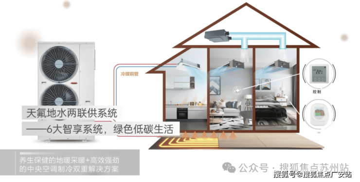 Shangrun Jingting has introduced the "Sky Fluorine Ground Water" two-in-one supply system, which means that the air conditioning for cooling in summer and the floor heating for heating in winter are all powered by the outdoor units of the Sky Fluorine Ground Water two-in-one supply system. With six systems including intelligent low-carbon, intelligent control cloud sensing, intelligent main cleaning, intelligent dynamic and static sound, intelligent dehumidification, and intelligent efficiency fresh air, it fully implements the "Two Intelligentives and One Full" good house standards advocated by Suzhou, truly achieving green, energy-saving and comfortable living.