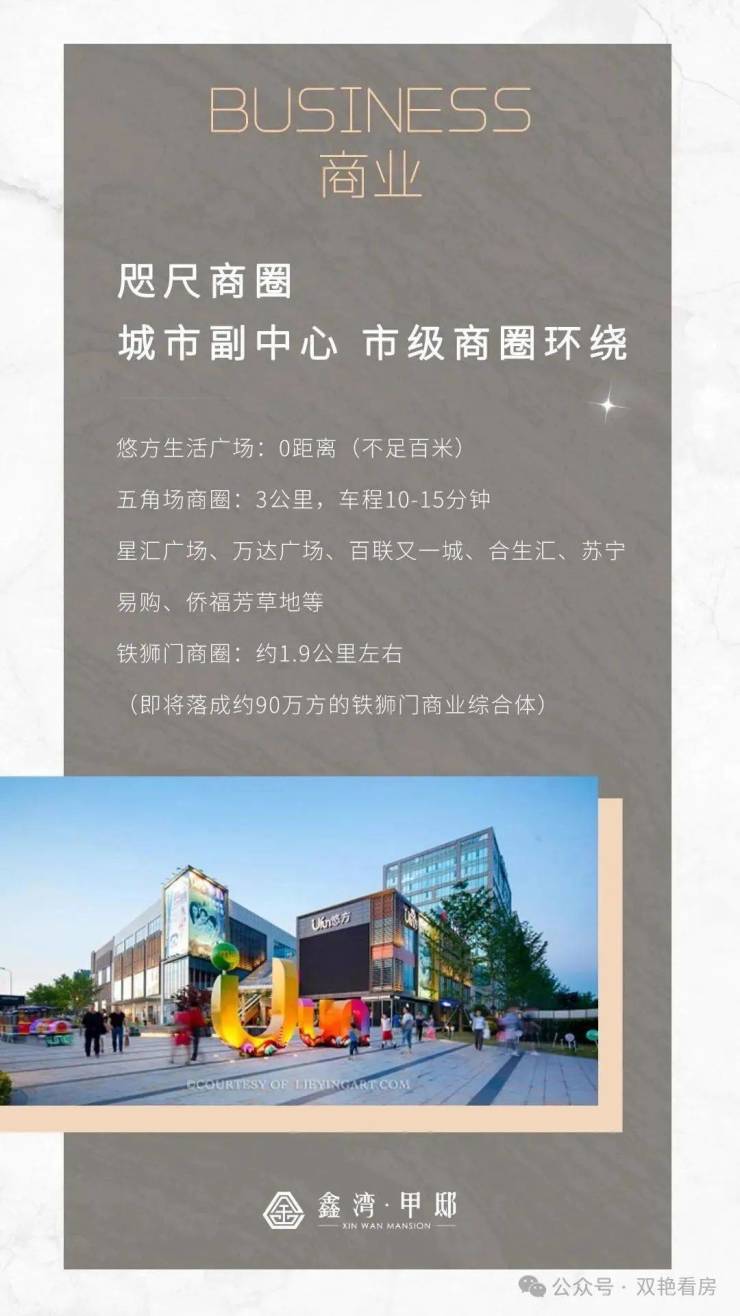 商业配套,悠方生活广场,不足百米五角场商圈,星汇广场、万达广场、百联又一城、合生汇、苏宁易购、侨福芳草地等铁狮门商圈约1.9公里左右(即将落成约90万方的铁狮门商业综合体)