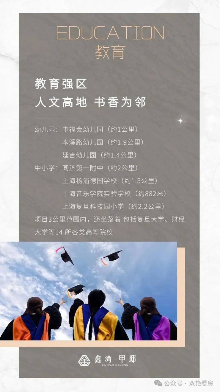 教育配套,幼儿园中福会幼儿园 (约1公里),本溪路幼儿园(约1.9公里),延吉幼儿园(约1.4公里),中小学同济第一附中(约2公里),上海杨浦德国学校 (约1.5公里),上海音乐学院实验学校 (约882米),上海复旦科技园小学(约2.2公里)项目3公里范围内,还坐落着包括复旦大学、财经大学等14 所各类高等院校。