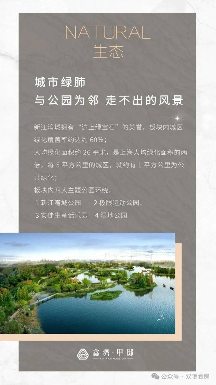 生态公园,新江湾城拥有“沪上绿宝石”的美誉,板块内城区绿化覆盖率约达约60%;人均绿化面积约 26平米,是上海人均绿化面积的两倍,每 5平方公里的城区,就约有 1平方公里为公共绿化;