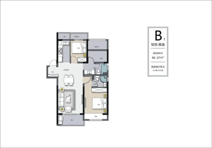 边户B1户型面积95.37㎡,户型方正,南北通透,双开间朝南。进门为玄关设计,增强公共空间的私密性。阔绰南向客厅,局部面宽约3.6米,采光十分通透。此户型最大亮点为南北双阳台的设计,北面增加了一个功能性阳台,可用于放置洗衣机等大型物件,提高了生活舒适度的同时也提升了住宅档次感。