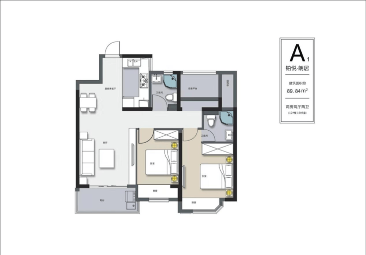 A1户型面积89.84㎡,为经典舒适的3房2厅2卫。本户型最大的亮点为3开间朝南,9.5米采光面,进门左边是厨房,右边是餐厅,可以避免厨房的油烟进入到客厅影响居住效果,3.6米面宽的南向客厅敞亮大气,朝南阳台为花桥唯一具有180°无死角观景效果的阳台。