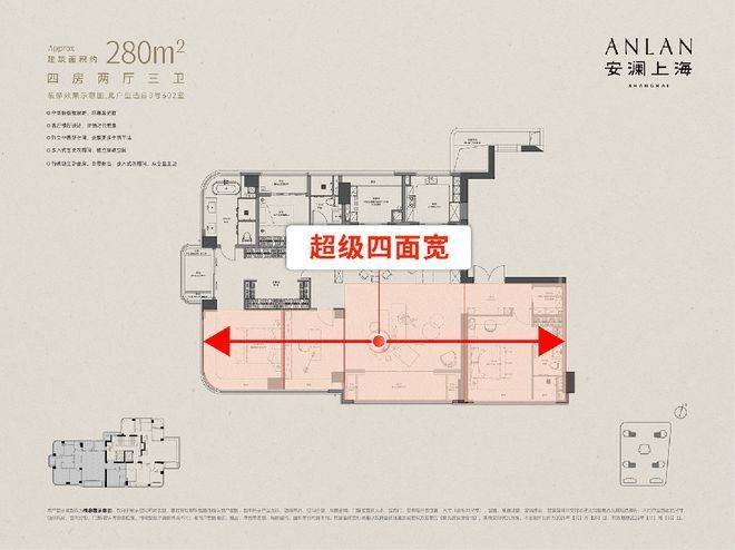 建面约280㎡4+1房户型,以约72㎡LDKB一体化厅,家庭互动核心;环幕总面宽约51米,南向面宽达22米;主卧配套齐全:衣帽间+空中花园;灵动空间可改造,适应多元需求。