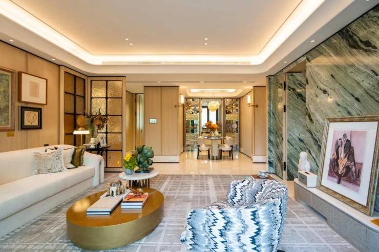 例如入户玄关铺设有“石材皇后”鱼肚印象”,这种级别的奢石在很多顶豪项目中通常仅作局部镶嵌