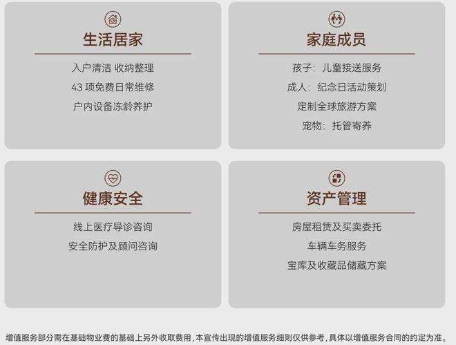 引入缦合物业“280+标准化服务+61项全球资源”,涵盖私宴定制、全球旅行、医疗健康等,叠加入户保洁、宠物托管等增值服务,打造高净值圈层专属生活方式。例如提供全球奢侈品酒店礼遇、名医绿色通道等稀缺资源。