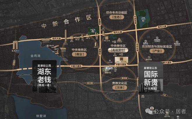 星塘街以西 ,是以湖东+湖⻄商务区为核心的城市“老钱”。星塘街以东,是以中央国际居住区为核心的国际“新贵”。