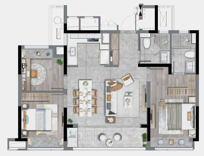 LDBK一体化的公区,充分实现了家庭成员间的互动;除了边厅外接的阳台外,南向次卧同样设计了阳台,兼顾了景观和晾晒的需求。