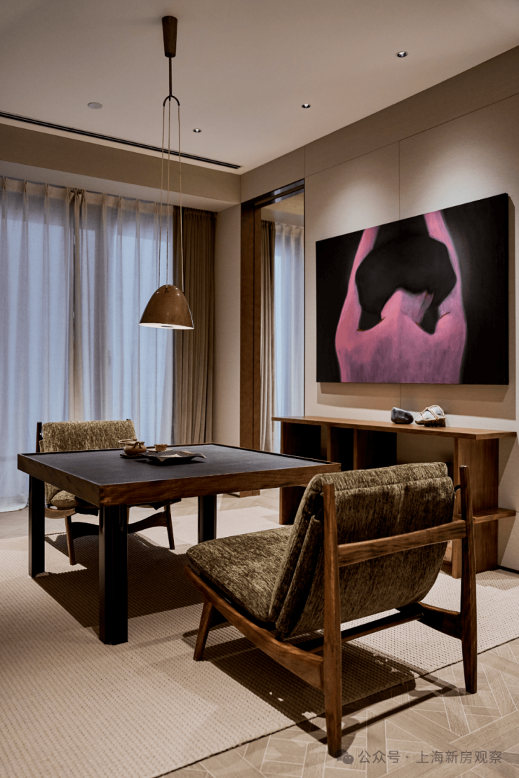 龙盛荟馆的接待处设计:空间讲究对称性、秩序感,暗绿纹哑光、温润的石材+仿铜金属板,调性和仪式感极佳,家具的选品又富有居家轻松氛围,有种俱乐部的感觉。