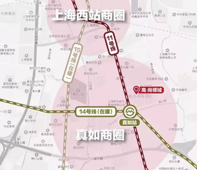 真如站:11和14号线相交,真如副中心核心上海西站:15和11号线相交,真如副中心北翼铜川路站:14和15号线相交,普陀区政府所在地