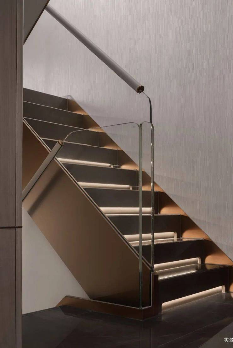 暮色渐沉,丹枫云庐的“光影艺术”方显真章。楼梯踏步的“隐藏灯带”如星河蜿蜒,与法国兰舍新风系统的低吟、德国威能地暖的暖意悄然相融。大金中央空调的静音气流拂过戴昆设计的臻奢空间场景,金属与石材在暖调灯光下泛起微光,空间成为一座私享的“光影博物馆”。