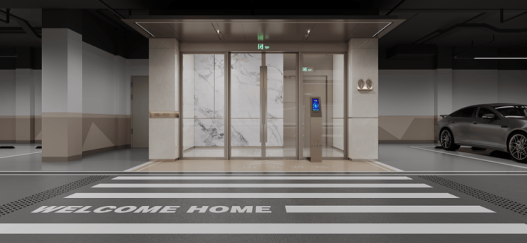 未来社区还设计了地下归家动线,精致景墙格栅凸显仪式感,业主开车进入地库,步行至地下入户大堂,也是满满的精致入户体验~