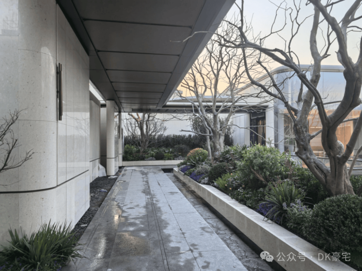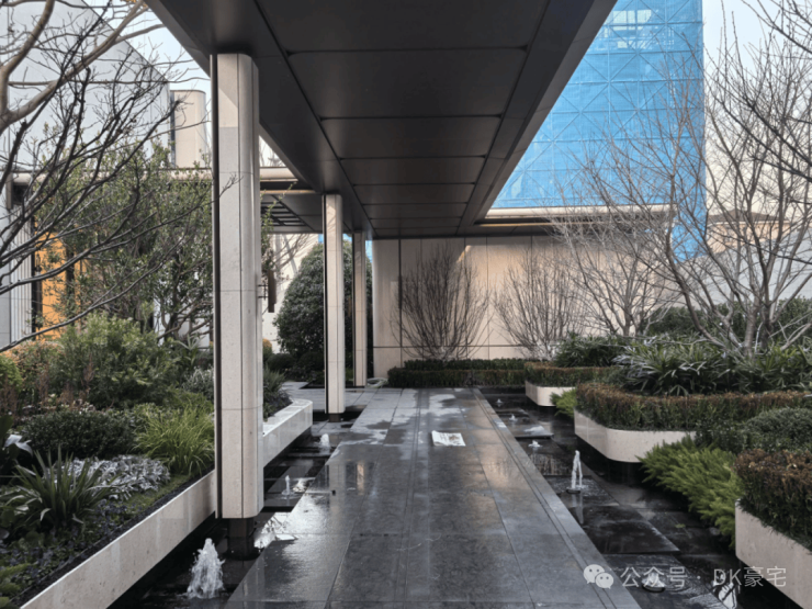 社区打造了总长约500米的风雨连廊,串联整个社区。连廊设计考究了经典徐汇建筑手法,两侧辅以独具韵味的自然怡景,实现诗人笔下的“户外风雨连绵,廊下月华如水”的生活情景。无论晴雨,业主从小区入口到单元门全程无需打伞,将顶豪级的居住体验落到了实处。