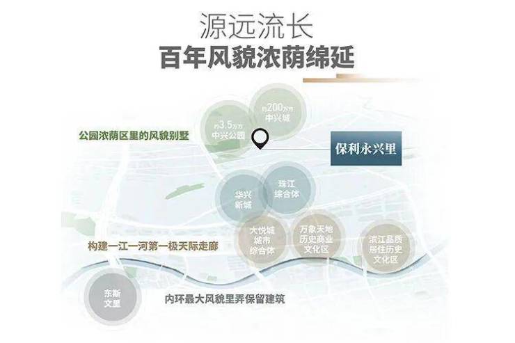 保利永兴里位于上海市静安区内环内,紧邻中兴公园,该项目地处 “一江一河”战略核心区,毗邻北外滩,距离外滩、陆家嘴直线距离均约3公里,周边集聚23家跨国公司地区总部、20幢亿元楼宇、70家高新企业、10余家国家级孵化器及市级科创基地等。约3.5km(百度直线距离)内人民广场、新天地、苏河湾、大宁、北外滩、陆家嘴、虹口龙之梦、四川北路商圈,屹立时代潮前。