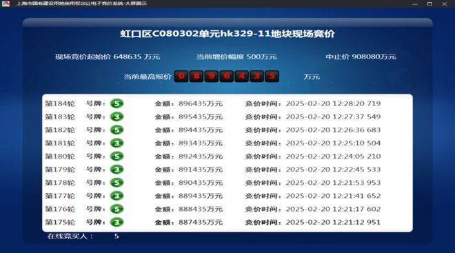 2025年2月,今年第一批次土拍中,经过184轮竞价,金茂&庆隆联合体以总价896435万元竞得虹口C080302单元hk329-11地块,溢价率38.2%,折合楼板价117474元/㎡,装修标准不小于4000元/㎡。