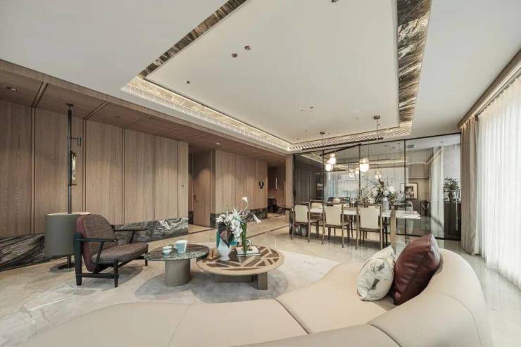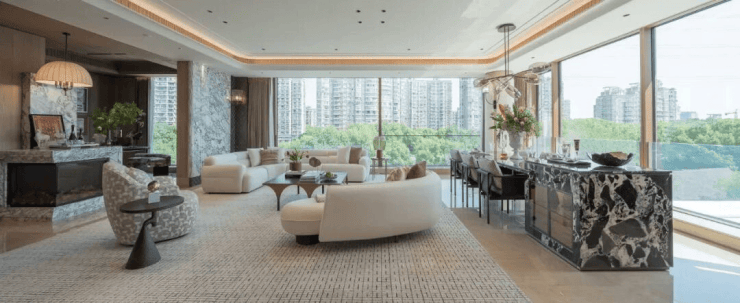 205方的由意大利设计师Andrea Bonini亲自操刀,紫山水石材从踢脚线攀升,直到客厅吊顶,在嵌入式灯带的烘托下,如月光般柔和,与温润的木饰面形成层次和谐的反差。大家咏印明庐售楼处电话:400-9016-520⭐⭐