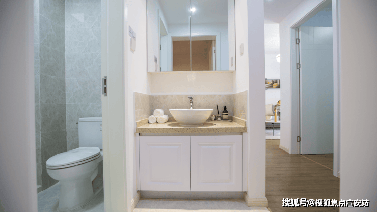 也正是因为一个卫生间,才能做出这样的尺度感。镜柜打开就是收纳空间,整体干湿分离,一边可以洗脸刷牙,一边可以上厕所,尽可能满足多人口使用的需求。即使早上也来得及,三口之家的使用绰绰有余。