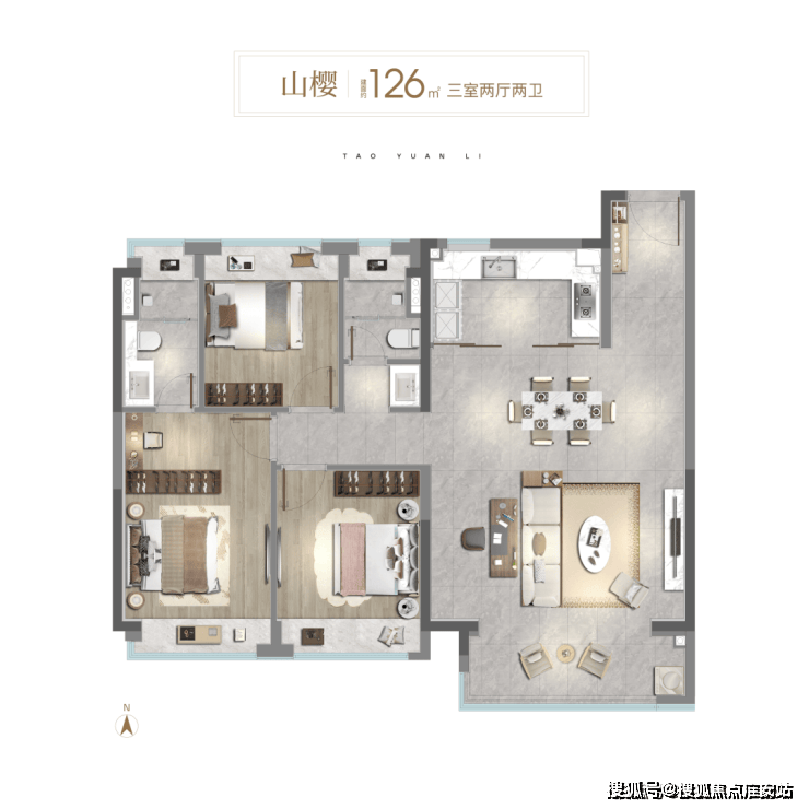 再来看看更阔绰的大3房,建筑面积约126㎡,采用主流的三开间朝南+横厅设计。