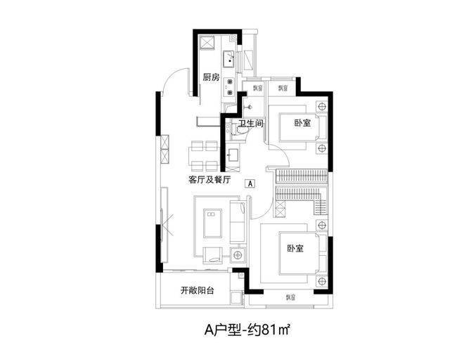 建面约81㎡2房功能齐全,拥有朝南大面宽和全卧飘窗设计。