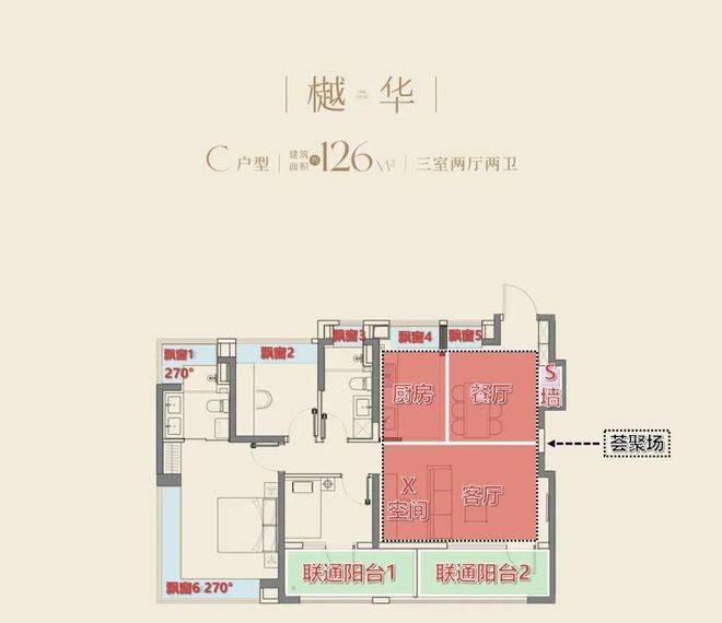 下图为边套户型,中间套户型南向为三阳台,主卧无270°窗!