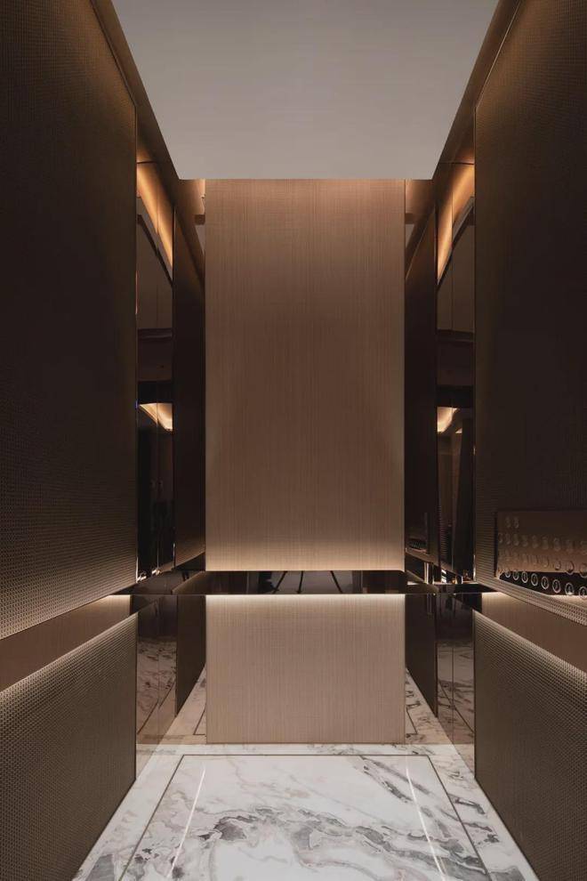 前厅大型竖向灯带一直延伸至屋顶,灯带体块、线条与挑高空间相互交融,使前厅空间更震撼、通透。灯带下方叶状艺术装置,犹如一叶扁舟,指引观者与设计师共同体会杭州之江人文之美;灯带上细腻花纹晕染开来,勾勒出江南特有之温婉神韵,营造出了更深层次的文化共鸣。