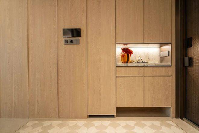 玄关收纳更精细,每个格子的规划都很贴近生活,随手物件,女主人的高靴,吸尘器、扫地机器人、行李箱等都有各自安置空间。